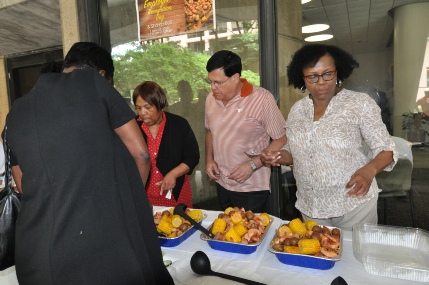Managers serving employees during annual shrimp boil, recognition and goals / vision update meeting.
